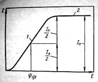 Участок 1 полярограммы, на котором ток возрастает, называют полярографической волной, а участок 2 – площадкой диффузионного тока. Потенциал электрода φ1/2 при поляризующем токе, равном половине предельного тока In, называют потенциалом вещества, потенциал полуволны – важная характеристика вещества, так как каждое вещество вследствие своих структурных особенностей восстанавливается при определённом его значении. По потенциалу полуволны определяют вид вещества, а по предельному току (высоте полярографичесок волны) – его концентрацию в растворе электролита поляроглафической ячейки.