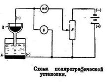 Напряжение (2–4 В) от внешнего источника питания через реостат R подается на ртутные электроды полярографической ячейки. Ток, проходящий через ячейку, измеряют микроамперметром mA, а напряжение, подаваемое на ячейку, регулируют перемещением движка на реостате R от нуля до максимума.