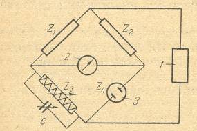 Z1, Z2, Z3, Z4 – плечи мостика, С – переменная ёмкость, 1 – генератор звуковой частоты, 2 – гальванометр, 3 – электролитическая ячейка.