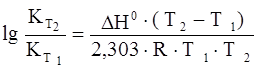 Зависимость константы равновесия от температуры (для температуры Т2 относительно температуры Т1) выражается следующим уравнением Вант-Гоффа: