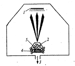 Обычно испаряемое вещество 5 помещают в нагревательную камеру 2 с нагревателем 4 и отверстием (диафрагмой), через которое испарившиеся частицы вещества попадают в вакуумное пространство (с давлением около 0,10–0,01Па), где происходит формирование молекулярного пучка. Частицы, двигаясь практически прямолинейно, конденсируются на охлаждаемой подложке 1.Откачка газа из аппарата осуществляется через клапан 3.