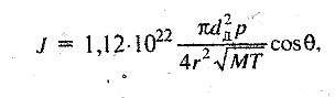 Если проводить испарение вещества в режиме, когда нет столкновения между частицами в пространстве диафрагмы, то длина свободного пробега частицы лч>dд (здесь dд - диаметр диафрагмы). Истечение пучка частиц из нагревательной камеры будет эффузионное; интенсивность пучка J, частиц/(см2·с), на расстоянии r от источника.