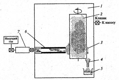 Полученный непрерывный поток кластеров или наночастиц поступает из реактора в рабочую камеру 1 аппарата, в которой создается давление порядка 1 – 50 Па. Конденсация наночастиц и осаждение их в виде порошка происходит на поверхности охлаждаемого вращающегося барабана 2. с помощью скребка 3 порошок удаляют с поверхности барабана; затем он через воронку 4 поступает в приемную емкость 5 и направляется на дальнейшую переработку.