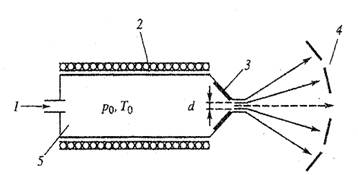 Молекулярные пучки большой интенсивности, когда J~1016 – 1018 частиц/ (см2·с), и с более низкой температурой по сравнению с эффузионными источниками можно получать с помощью сверхзвукового истечения из сопла. Образующийся в источнике относительно плотный горячий пар вещества 1 (рис 3.) термостатируется в камере торможения 5, где с помощью нагревателя 2 поддерживаются давление Р0 и температура Т0, и выпускается через сопло 3 с диаметром d~1 мм в вакуум или буферный газ. В результате образуется расширяющийся пучок частиц с малым углом расхождения. Тепловая энергия потока горячего газа или пара в камере торможения трансформируется в кинетическую энергию сверхзвукового потока. Сформировавшийся поток движется в направлении от плоскости среза сопла к подложке 4 и расширяется, что приводит к его охлаждению. В результате охлаждения газ превращается в пересыщенный пар, внутри которого могут зарождаться кластеры, содержащие от 2-106 атомов [2].