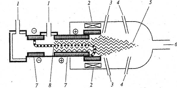 Реактор включает следующие основные узлы: электроды 7, патрубки 1 для входа плазмообразующего газа, катушки электромагнитов 2, для поддержания плазменной дуги, патрубки 3 для ввода реагентов, устройства ввода холодного газа 4, приемное устройство продуктов синтеза 6. образующийся между электродами столб дуги 8 образует поток плазмы 5; при этом в реакторе достигается температура 1200 - 4500 К. Полученные продукты закаляют различными способами: в трубчатых теплообменниках, посредством затапливания потока реагирующей смеси струями холодных газов или жидкости, в охлаждаемых соплах Лаваля [2].