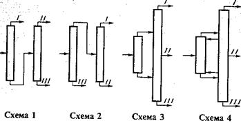 Рис. 1.7. Схемы разделения смеси на три продукта [15]. I-III – продукты.