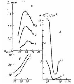 Итак, в результате химического превращения эпоксидного олигомера ухудшается его растворяющая способность по отношению к олигомерному каучуку, и по достижении определенной степени этого превращения система оказывается термодинамически неспособной сохранять фазовую однородность. При благоприятных кинетических условиях начинается разделение отверждающей системы на две фазы. Характер процесса фазового разделения раскрывается при исследовании кинетики роста частиц гетерофазы в ходе отверждения эпоксидно-каучуковой системы. На рис. 5, а, б приведены кривые изменения среднего размера и концентрации частиц ПЭФ-ЗА в зависимости от степени химического превращения эпоксидного олигомера, полученные методом спектра мутности. Экстремальный характер указанных кривых означает, что в определенном интервале степени химического превращения эпоксидного олигомера растущие частицы пополняются новой фракцией. Возникновение новых частиц на более поздних стадиях химического превращения эпоксидно-каучуковых систем (новообразование) приводит к уменьшению среднего размера частиц и увеличению их концентрации. Наблюдаемое уменьшение концентрации частиц каучука до новообразования позволяет сделать заключение об интенсивном протекании процессов «диффузионного поедания» более мелких частиц. Следовательно, рост частиц каучука до новообразования осуществляется не только за счет «диффузионной подпитки» растущих центров, но и за счет агрегации мелких частиц. Зависимость степени фазового разделения от глубины химической реакции в системе существенно нелинейна (рис. 5, в). Положение изломов на кривых находится в области критической степени химического превращения эпоксидного олигомера (а=0,58 [13]).