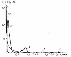 Рис. 6 Кривые распределения частиц дисперсной фазы по размерам в отвержденной системе ДГР — ДАП - каучук: 1 — СКН-8-к, 2 - СКН-14-к, 3 - ПЭФ-ЗА