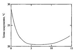 Рис. 7. Влияние добавок высокомолекулярного углеводорода на точку помутнения