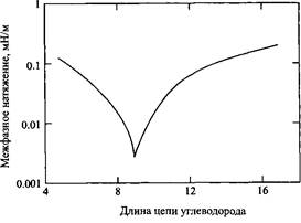 В реальных ситуациях масло не является переменным параметром, за исключением случаев, когда используются чистящие композиции, содержащие углеводород. В последнем случае исходные чистящие композиции представляют собой микроэмульсию. В модельных экспериментах можно варьировать природу масляной фазы, сохраняя постоянными температуру и выбранное ПАВ. На рис. 8 на зависимости межфазного натяжения от длины цепи молекул углеводорода виден отчетливый минимум, соответствующий углеводороду с определенной молекулярной массой. Для этого конкретного масла температура, при которой проводили измерения, соответствует ТИФ системы.