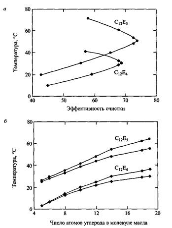 Фазовое поведение микроэмульсий иллюстрирует фазовое поведение при температурах ниже и выше ТИФ. Из данных, приведенных на рис. 9, можно сделать вывод, насколько важны сбалансированные системы для очистки от загрязнений. Для двух неионных ПАВ оптимальное моющее действие наблюдается при температуре, при которой тройная система ПАВ-углеводородное загрязнение-вода образует трехфазную систему.
