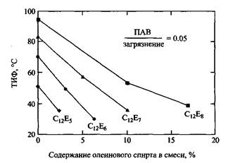 Рис. 10. Влияние добавок олеинового спирта в систему НПАВ-гексадекан - вода на температуру инверсии фаз. С разрешения American Oil Chemists Society