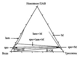 Рис. 22Al. Фазовая диаграмма системы НПАВ-триолеин-вода: M — фаза, обогащенная триглицеридом; Spo — губчатая фаза, аналогичная фазе L3 бинарной системы НПАВ-вода