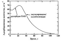 Методы, использующиеся для изучения отмывания загрязнений в контролируемых условиях, включают измерения отражательной способности с использованием специальных приборов для прачечных, определения остаточных загрязнений с помощью радиоактивных индикаторов, а также прямое оптическое наблюдение за количеством адсорбированного на поверхности загрязнения. С помощью эллипсометрии можно непосредственно измерять количество загрязнения на поверхности на молекулярном уровне. На рис. 13 показаны результаты наблюдения за процессом отмывания с помощью этого метода. Исходная поверхность была загрязнена адсорбированным слоем масла. Сначала наблюдается увеличение количества вещества на поверхности, что можно объяснить образованием монослоя ПАВ. Затем следует эмульгирование и солюбилизация, и общее количество материала на поверхности постепенно уменьшается. После промывания получается абсолютно чистая поверхность.
