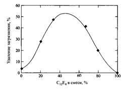 Рис. 14. Зависимость степени удаления масляного загрязнения от содержания гидрофобного этоксилированного спирта С12Е4 в смеси с гидрофильным анионным ПАВ