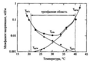 Рис. 19. Зависимость межфазного натяжения от температуры для системы масло-вода-НПАВ. Символы гп/w, Ym/o и Ym/w соответствуют межфазному натяжению на границах мало-вода, средняя фаза-масло и средняя фаза-вода. Система сбалансирована при 300C
