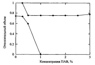 На рис. 21 показана зависимость относительных объемов фаз от концентрации ПАВ для системы, содержащей этоксилированный алкилсульфонат с разветвленным гидрофобным радикалом, структура которого отвечает общей структуре, представленной на рис. 20. ПАВ подобрано с учетом специфических условий пласта. Обратим внимание, что переход система Винзора I —> система Винзора III —> система Винзора II происходит при разбавлении раствора ПАВ, что важно учитывать для оптимизации процесса нефтевытеснения. В системе, представленной на рис. 21, переход от микроэмульсии типа Винзора I к микроэмульсии Винзора III происходит при концентрации ПАВ, равной 1%, а от микроэмульсии Винзора III к микроэмульсии Винзора II — вблизи концентрации 0.25%. Система оказалась высокоэффективной в опытах по вытеснению нефти из заводненного нефтяного пласта. Из нефтяной породы, где половина пор заполнена нефтью, при прокачке раствора, содержащего 2 мае. % ПАВ в морской воде, было выделено 89% нефти, оставшейся в породе после обводнения.