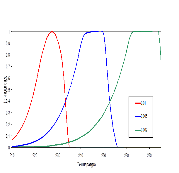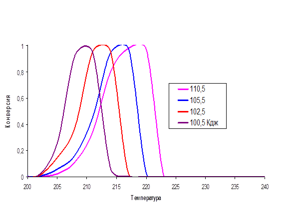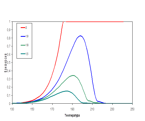 На рис.4 видно, что с уменьшением энергии активации максимум конверсии смещается в область низких температур Этот факт соответствует экспериментальным данным, и, следовательно, подтверждает физический смысл полученной модели.
