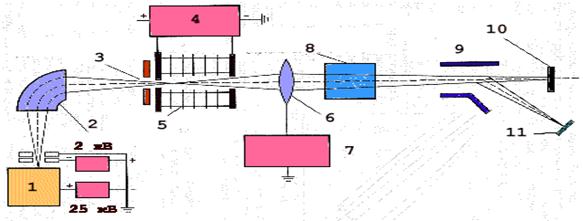 Магнитный масс-спектрометр предназначен для отделения ненужных ионов от легирующих, электрометр - для измерения величины имплантированного потока ионов. Маски для ИИ могут быть изготовлены из любых материалов, используемых в технологии СБИС (фоторезист, нитриды, окислы, поликремний).