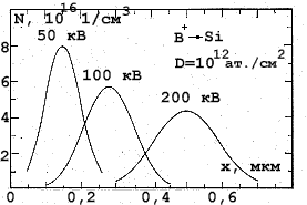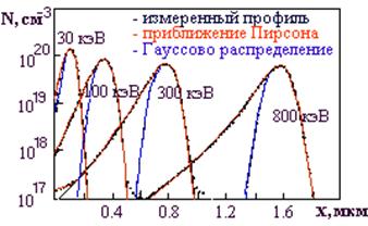 Профиль распределения примеси при ионной имплантации бора различных энергий в кремний приведен на рис. 2. Для корректного теоретического расчета профиля, особенно для больших значений энергий пучков ионов, используют два объединенных распределения Гаусса