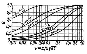 Рис.2.2 Номограмма для определения безразмеоной температуры в сечении неограниченной пластины при
