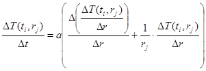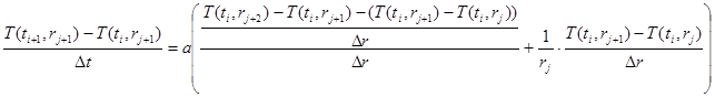 T(i+1,j+1)=T(i,j+1)+(a*dt/dr)*(((T(i,j+2)-2*T(i,j+1)+T(i,j))/dr)+((1/r)*(T(i,j+2)-T(i,j+1)))); (4.14)