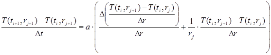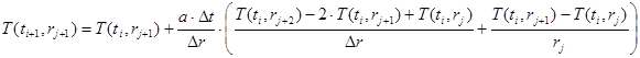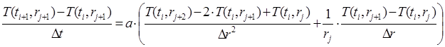 T(i+1,j+1)=T(i,j+1)+(a*dt/dr)*(((T(i,j+2)-2*T(i,j+1)+T(i,j))/dr)+((1/r)*(T(i,j+2)-T(i,j+1))));
