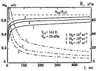 стабилизируется тем быстрее, чем выше Nb. При больших концентрациях квазиравновесное давление со временем постепенно понижается по мере роста пузырьков в ансамбле, что объясняется постепенным охлаждением жидкости и уменьшением величины Psat(Tl). Различие в окружающем давлении