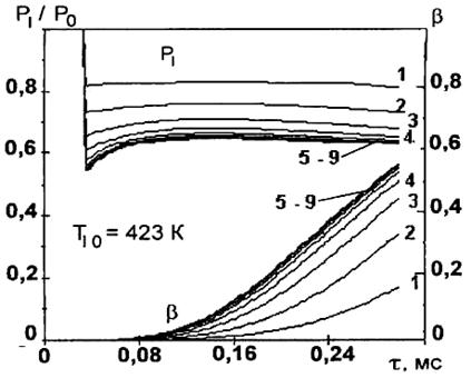 На рис.3 показано изменение со временем объемного паросодержания b и величины приведенного давления