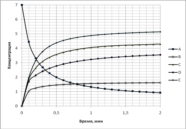 Из расчета и графика профилей концентраций видно, что максимальное увеличение концентрации вещества С в зоне реакции приходится на t = 0,9 мин – далее его количество увеличивается незначительно и не прореагировавшее сырье целесообразнее направить на рециркуряцию. Следовательно, для достижения наибольшего выхода вещества E рекомендуется уменьшить время контакта до 0,9 мин. Это можно осуществить, как уменьшив объём реактора (V) на стадии проектирования, так и увеличив скорость подачи сырья (U) на стадии реализации данного ХТП.