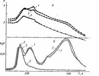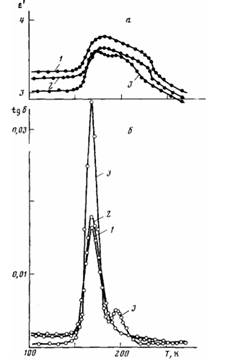 Максимуму, связанному со стеклованием, отвечает возрастание е'; максимум tg б в области 190—220 К также находит отражение в возрастании е', величина которого резко уменьшается при 235 К (плавление) и вновь возрастает в области следующего максимума. При 370—390 К (высокотемпературный максимум) значение е' уменьшается.