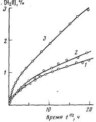 В то же время образцы наполненных сшитых каучуков, находившихся длительное время (от 1 месяца до 1 года) в обычных условиях при комнатной температуре, характеризуются принципиально иными температурными зависимостями tg б и ε ' (рис. 2). Новые максимумы tg б не исчезающие после выдержки при 190 К, но исчезающие после прогревания при 470 К, естественно связать с наличием сорбированной воды. Поэтому трактовка обнаруженных максимумов требует изучения влияния сорбированной воды при различных ее концентрациях. С целью проведения такого исследования образцы различных ненаполненных и наполненных сшитых каучуков, предварительно прогретых при 470 К в течение 4 ч, выдерживали при комнатной температуре в насыщенных парах дистиллированной воды (в отдельных случаях в конденсированной воде). По истечении определенных промежутков времени образцы взвешивали и определяли таким образом количество сорбированной влаги. Десорбцию проводили прогреванием образцов при 470 К до постоянного веса. На рис. 3 в качестве примера приведены кривые кинетики сорбции влаги некоторыми наполненными сшитыми каучуками.