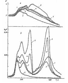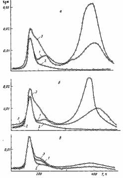 Высокотемпературный максимум мы объясняем десорбцией воды, т. е. разрывом различных сорбционных связей, что сопровождается подвижностью диполей. Максимум высокотемпературного пика находится в области 370—410 К, несмотря на это он весьма широкий и лежит в интервале от 280 до 470 К. Это наводит на мысль о том, что этот максимум суммарно описывает мультиплетные максимумы, отражающие разрывы различных по прочности связей, соединяющих молекул воды как с наполнителем, так и друг с другом. Иногда мультиплетность наблюдается в виде отдельных максимумов.