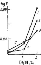 Рис. 5. Зависимости абсолютных значений tg6 от количества сорбированной влаги для образцов СКТ, наполненных 35 вес. ч. аэросила 300, в областях температур 370-390 (1), 255-260 (2) и 190-220 К (3)