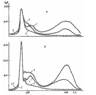 Рис. 7. Температурные зависимости tg б, полученные после резкого охлаждения образцов СКТВ-1, наполненных 15 вес. ч. аэросила 300 (а) и СКТВФ, наполненных 35 вес. ч. аэросила 300 (б) после хранения в течение 1 года (1) после прогревания при 470 К (2). 3 — концентрация влаги 1,0 (а) и 1,2% (б)