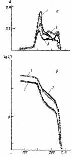 Рис. 8. Температурные зависимости логарифмического декремента затухания Д (а) и логарифма действительной части комплексного модуля сдвига G (б) образцов СКТВ-1 (резкое охлаждение) (1), СКТВ-1, наполненных 15 вес. ч. аэросила 300 (резкое охлаждение) (2) и СКТВ-1, наполненных 15 вес. ч. аэросила 300 и выдержанного при 190 К (3)