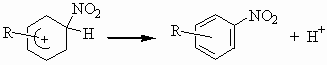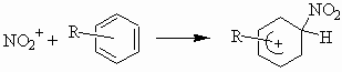 Нитрование ароматических углеводородов нитроний-катионом протекает как ионно-комплексная реакция. Сначала нитроний катион NO2+ присоединяется к ядру ароматического углеводорода,