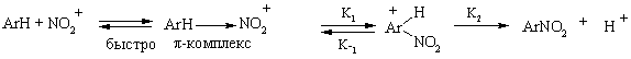 Более подробно этот процесс можно расписать через образование π- и σ- комплекса. Лимитирующей стадией является образование σ- комплекса, т.е. скорость процесса нитрования определяется скоростью присоединения нитроний-катиона к углеродному атому в молекуле ароматического углеводорода, так как протон отщепляется от этого углеродного атома почти мгновенно. Лишь в отдельных случаях нитрования в пространственно затрудненное положение отмечался значительный первичный кинетический изотопный эффект, обусловленный, очевидно, ускорением обратной реакции на стадии образования σ- комплекса из-за стерических препятствий и именно в таких случаях стадия образования σ- комплекса не является лимитирующей. К таким примерам относятся нитрование антрацена в положение 9 солями нитрония (KH/KD=6,1 в ацетонитриле, 2,6 в нитрометане), нитрование 1,3,5-три (трет-бутил)-2-R-бензолов азотной кислотой в серной кислоте (R=F, NO2, CH3, KH/KD=2,3-3,7). Но в большинстве случаев стадия образования σ- комплекса является определяющей для скорости процесса.