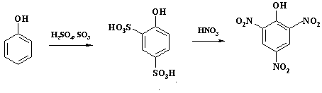 На первой стадии образуется фенол-2,4-дисульфокислота, сульфогруппы в которой далее замещаются нитрогруппами и проходит нитрование в положение 6 цикла.