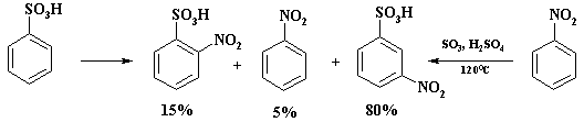 Низкая региоселективность наблюдается при нитровании бензолсульфокислоты. Наряду с м-нитробензолсульфокислотой образуется до 15% о-изомера. Однако трудно объяснить наличие в реакционной массе нитробензола, т.к. концентрация отработанной серной кислоты составляет 93 – 95%, а в этих условиях процесс десульфирования маловероятен.