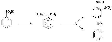 Катион нитрония атакует атом углерода связанный с сульфогруппой. Образующийся «аномальный» s-комплекс переходит в ароматическое состояние как за счет отщепления сульфогруппы, так и за счет смещения нитрогруппы к соседнему атому углерода (1,2-сдвиг) и отрыву протона от «нормального» s-комплекса.