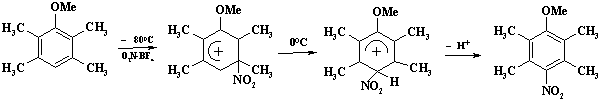 Образующийся «нормальный» s-комплекс теряет протон и превращается в 4-нитро-2,3,5,6-тетраметиланизол.
