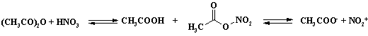 Для решения проблемы низкой селективности процесса проводят нитрование в среде уксусного ангидрида. При нитровании в уксусном ангидриде образуется ацетилнитрат, который в малой степени дает катион нитрония: