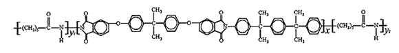 Единичный блок тройного сополимера, в центре которого находится полиимидный жесткий фрагмент, а по краям к нему примыкают гибкие полиамидные цепи.