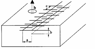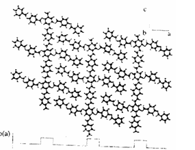 Упаковка боковых ответвлений должна содержать рыхлые участки, о чем свидетельствует высокая интенсивность малоуглового рефлекса с d~ 18.6 А, являющегося результатом дифракции на одномерной системе, представляющей собой чередующийся ряд основных цепей и упаковки заместителей (рис. 36). Таким образом, главные цепи вместе с боковыми ответвлениями образуют слоевую структуру - плоскость (ас) (рис. 36), в которой наблюдается дальний порядок расстояний а между основными цепями, обусловленный одинаковой длиной боковых ответвлений [порядки рефлекса (100)] и расстояний с, связанный с регулярностью основной цепи [порядки рефлекса (001)]. Наблюдаемый размытый рефлекс с