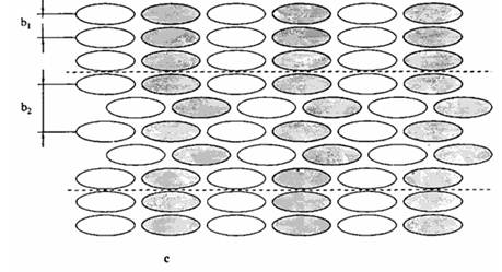 Рис. 4. Иллюстрация гипотезы о существовании двух типов слоевых упаковок с bj = 3.40 ubi = 5.07 А в полимере 6. Показано сечение упаковки по плоскости (200), т.е. укладка бензольных колец боковых ответвлений. Заместители соседних по а макромолекул отличаются на рисунке различным тонированием.