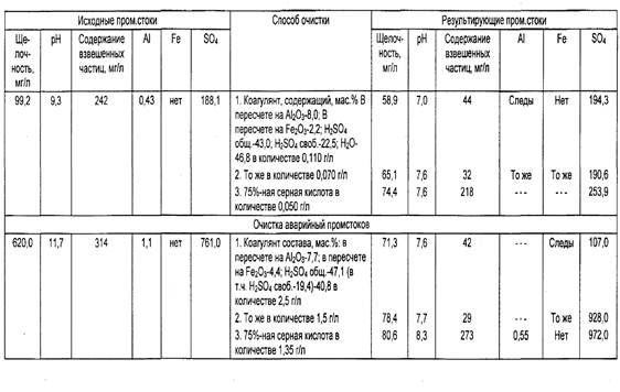 В 1997 в технологии очистки сточных вод был получен коагулянт из красного шлама. Сущность изобретения: красный шлам глиноземного производства обрабатывают 3–5% соляной кислотой. Полученный твердый остаток обрабатывают 50–55% серной кислотой. Полученную пульпу фильтруют и к полученному раствору добавляют концентрированную серную кислоту до ее общего содержания в растворе 25–50%. Полученный раствор выдерживают 10–20 ч. и отделяют полученный осадок. Осадок представляет собой неорганический коагулянт, содержащий компоненты в мас.%: смесь А12(SO4)3*nН2О, где n=6, 12, 14 и А12(SO4)3*Н2SO4 *12Н2O в пересчете на А12O3-2–10, FеSO4* Н 2O в пересчете на Fе2O3 – 2–10, Н 2SO4 общая – 40–60 (в том числе Н2SО4 свободная-20–40) и Н2O кристаллизационная до 100%. Полученным коагулянтом обрабатывают щелочные сточные воды [9,11]. Примерные результаты обработки сточных вод приведены в таблице 2