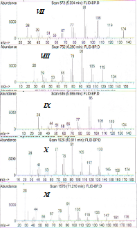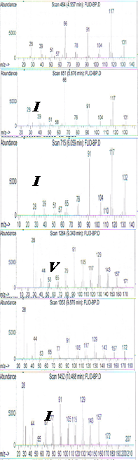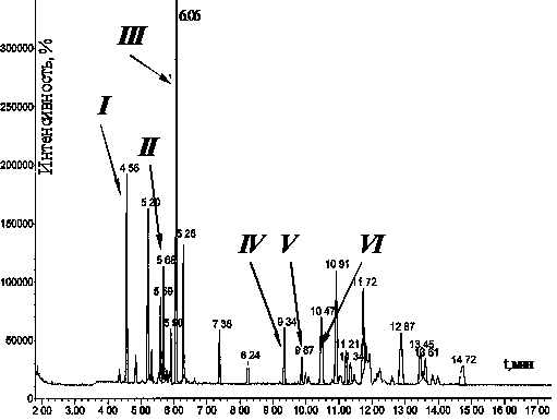 Взаимодействие НБД с АФ приводит к образованию разнообразных соединений количественно превышающих число продуктов аллилирования НБД другими аллиловыми эфирами. Типичная хроматограмма реакционного раствора приведена в пункте 2.5.