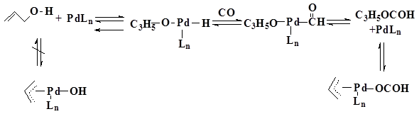 Для всех R, являющихся алкильными или арильными радикалами, распад этого интермедиата в результате восстановительного элиминирования приводит к образованию кислоты RCOOH. В случае R = H ситуация принципиальна иная. Известно, например, что в присутствии комплексов Pd, муравьиная кислота является является гидрирующим агентом и распадается с образованием CO2.