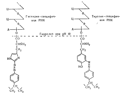 В другом методе, имеющем значительную потенциальную ценность, используется поперечно сшитый полидиазостирол, полученный в результате реакции полиаминостирола с азотистой кислотой; метод основан на наблюдениях, что соединения дназония легко реагируют с некоторыми аминокислотами с образованием ковалентно связанных производных. В пределах рН от 7 до 8,5 быстро реагируют только тирозин и гистидин. Препараты транспортных РНК, полностью этерифицированные аминокислотами, встряхивали с нерастворимым полидиазостиролом, который реагировал только с нуклеиновыми кислотами, меченными тирозином и гистидином.